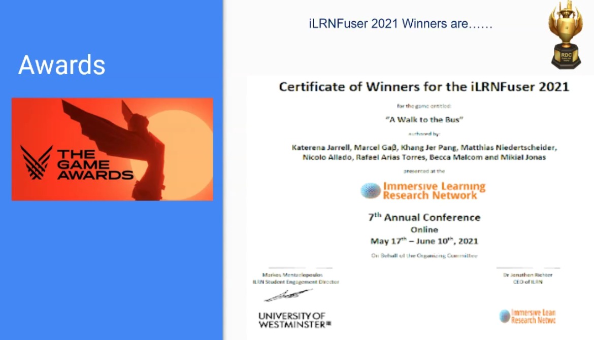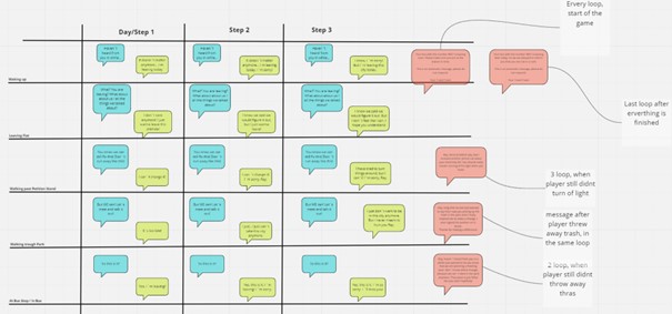 My contributions specifically were designing the core game play concept and features of the game. This included the logic for the repeating loop of the game and how to progress, as well as communicating a sense of progression to the player even though the level was started over and over again. I decided to do this with subtle changes in the environment in addition to a dialog system. This sytem was also designed and written by me, adding more depth and backstory to the game.